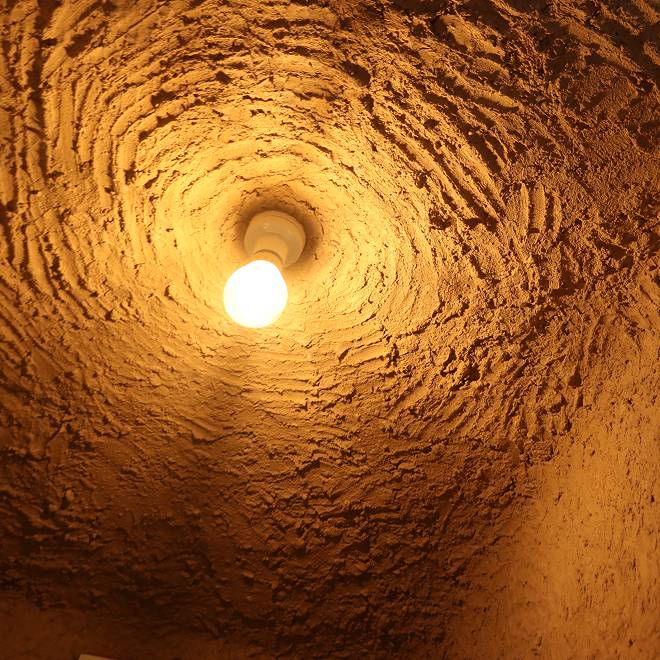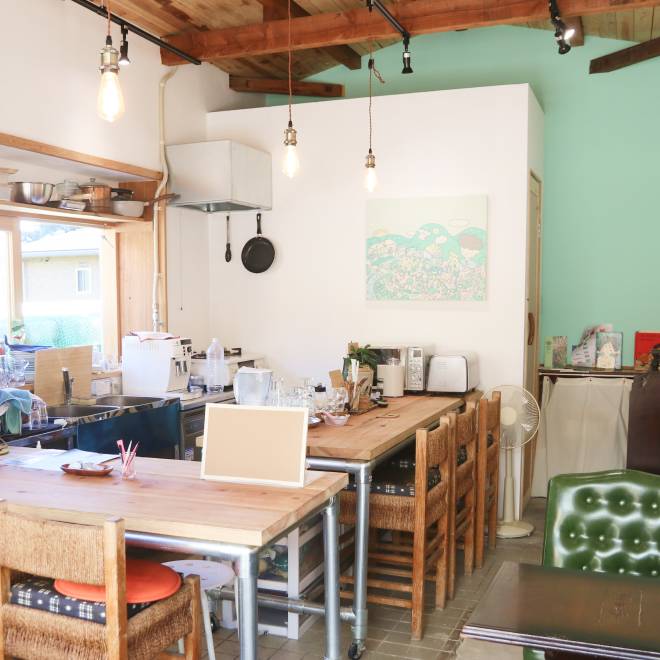 さらに特徴的なところは、住民参加型でリノベーションを進めたところです。カフェスペースのペンキ塗りや壁面の本棚作り、トイレの壁土の左官作業…。さまざまなワークショップを実施し、地域内外から多くの方が参加しました。「私はここ以外に空き地を2カ所借りています。トイレの土壁はその1カ所の空き地で穴掘りをした土を使いました。その土にしっくいを混ぜて塗り、参加者と私が手のひらで模様を付けたオンリーワンの土壁。眺めていると、参加者が生き生きと土に触る表情が目に浮かび、歓声が聞こえてくるようです。「あとは旧大日温泉の風呂場からはがれ落ちたタイルを床材にはめ込む作業も、子どもたちが遊び感覚で参加してくれました」。そうして形にも記憶にも刻まれていった計5回のワークショップ。参加者の中から、喫茶店の運営メンバーに手を挙げる人が1人、2人と増えていくのも自然で理想的な流れでした。ワークショップに参加したのを機に、市内外から町に遊びにくるようになった方もいるそうです。