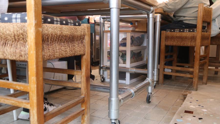 リノベーションに関する設計は上野さんと合同会社ものがたり工作所 小畦さん、工事は合同会社廃屋が中心メンバーです。奥にトイレスペースを新設する大工仕事は業者に依頼しましたが、基本はDIY&低予算で、あるものを有効利用しながら4カ月かけて行いました。例えば昔ながらの揺らぎガラス入りの玄関戸は、空き家の掘り起こし作業で入手した中古品を再利用。解放できる折れ戸式になっていて、イベントなどを開く際に便利です。二人掛けのイスやテーブルは、喫茶店や居酒屋のお下がりが活躍していて統一感のなさこそが魅力です。店内で存在感を示す大きなカウンターテーブルは、ホームセンターで手に入る足場板に単管パイプを組み合わせ、足元には移動キャスターを付けたお手製。普段は対面カウンターとして、ミーティングやパーティーなどのときは移動してテーブルを大勢で囲み、使用しています。ちなみにリノベーションの費用は合計400万円。神戸市の「建築家との協働による空き家活用促進事業」に応募して採用されたため、半分の200万円を補助金でまかなうことができたそうです。