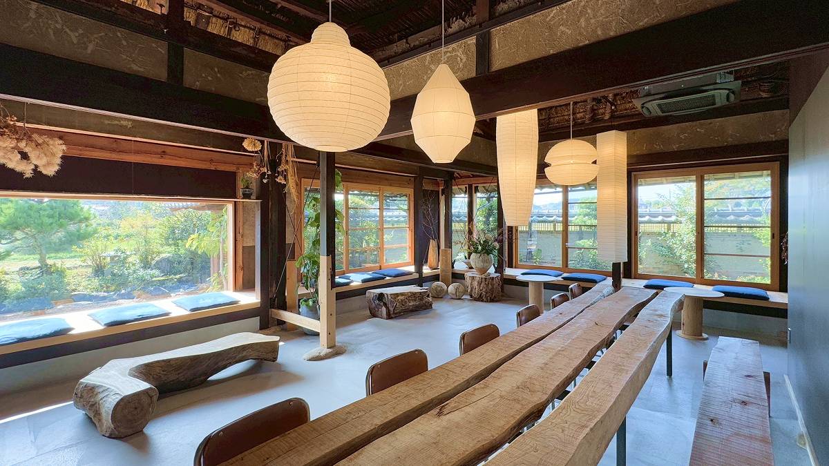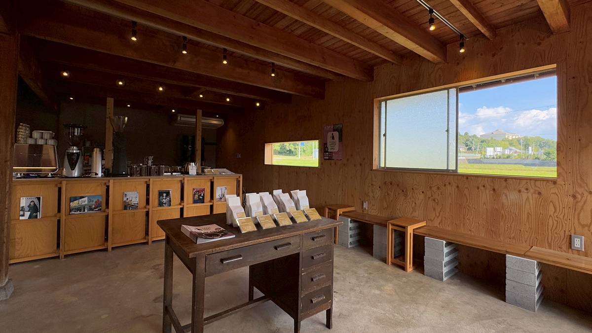 COFFEE」では、焙煎したコーヒーの粉を漆喰に混ぜて壁に用いるという店主ならではの工夫も。また、外観では土壁や門を取り除き、窓から田園風景を見渡せる開放的なつくりに。季節によって青々とした稲や黄金色の稲穂が広がり、四季を肌で感じられます。