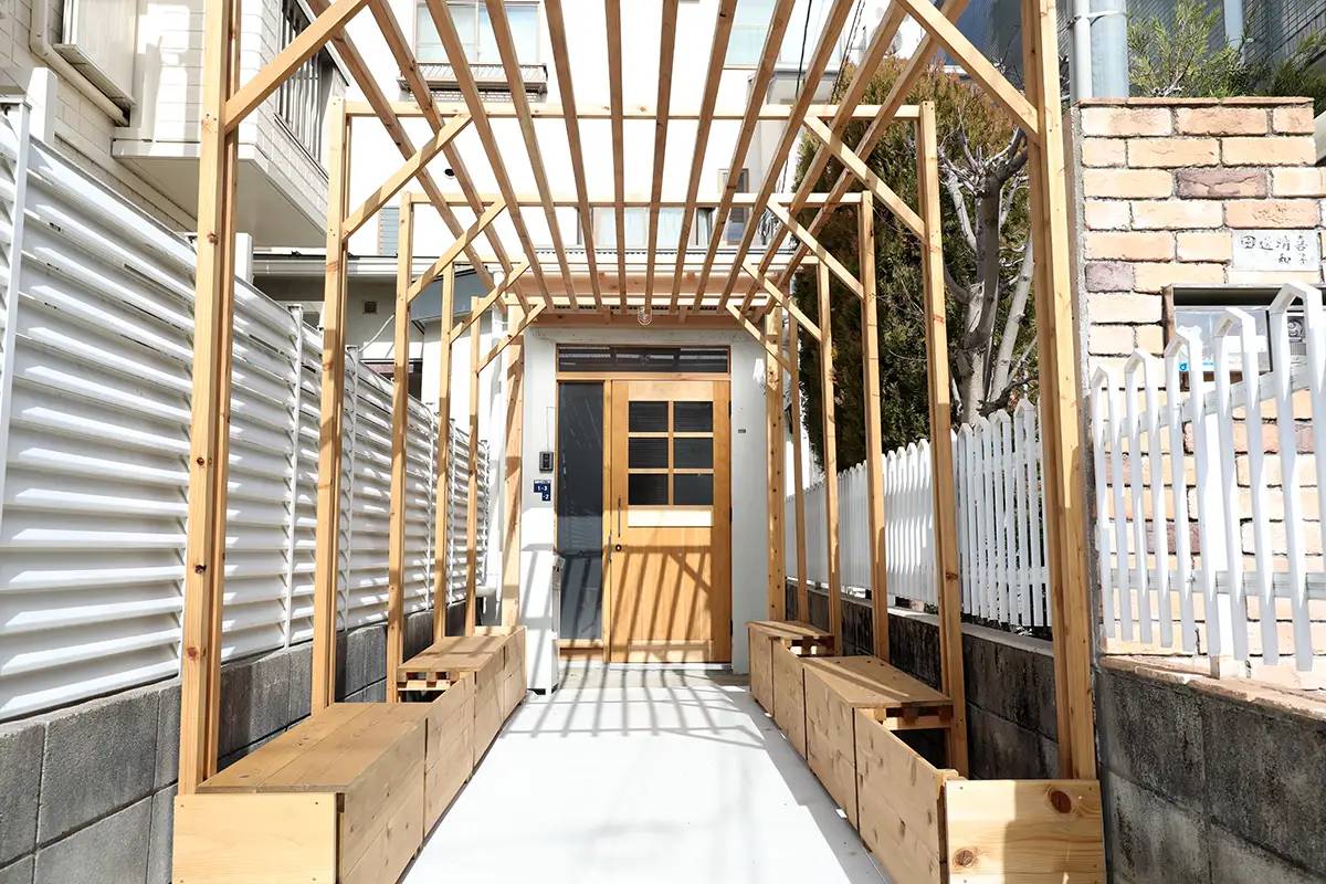 つくりたい場の方向性は決まりましたが、すべてをレンタルスペースにするのではなく、自身のオフィスももちろん併設です。平屋の一軒家、限られた空間に2つの機能を持たせる。そのため、完全にスペースを分離しました。改修にあたっては、できるだけ現状を活かすのが私のポリシーです。柱や壁は、ペンキで塗装しましたが、基本の躯体はそのまま残しました。とくかく暑い家でしたので、天井を抜いて断熱材を入れました。外観がどう見てもふつうの住宅にしか見えなかったため、駐輪場も兼ねる道路から玄関までのアプローチには、ベンチとプランターが一体化した木製の意匠を施すなど工夫し、レンタルスペースとしてのウエルカム感を出しました。場の汎用性を考え、床を取り外し土間にしたのですが、いざ床を開けると柱が地面に届いておらず、鉄板を継ぎ足す処理を施しました。この時もそうでしたが、トラブルや問題があった際はいつも、他の職人さんやブレーンの意見を参考にします。建築家として設計の知識は十分にありますが、構造の知識、大工の知識、管理者の知識、意匠の知識など、それぞれの専門家の声を聞くことで、その場で最善策が生まれたりします。経験上、自分の意見にこだわらない方が、良い解決策につながるものです。