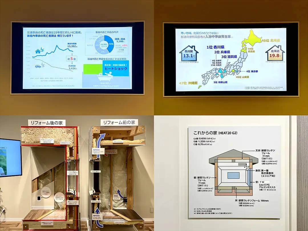 LIXIL住まいStudio大阪は、2020年の3月にオープンした、住まいの断熱のメリットを比較・体感いただけるショールームです。冬の寒さや夏の日差しを体感できるコーナー、窓の比較ができるコーナーなど、いくつかのエリアを巡る見学ツアーには、これまでに13,000名以上のお客様をお迎えしています。ツアーの初めにはまず、住まいの断熱と健康リスクの関係について詳しくご紹介いたします。なぜ断熱が必要なのかを、さまざまなデータを使ってご説明しています。その先が体験コーナー。当施設でいちばん人気の冬体感のエリアです。気温0℃の巨大冷蔵庫内に建てられた「昔の家(省エネルギー基準:昭和55年基準)」、「今の家(省エネルギー基準:平成28年基準)」、「これからの家(HEAT 20 G2)※」、「リフォームの家(HEAT20 G2)※」の中で、空間や床、窓際の寒さ、廊下やトイレの冷えをリアルに体験。断熱性能が高くなると、どれくらい室温が変わるのか、どれほど寒さや冷えがなくなるのか、温度をビジュアル化するサーモカメラの映像をご覧いただきながら比較体験していただけるようになっています。また、体感した断熱のしくみがわかるようにパネルや模型でも展示しています。さらに夏体感のエリアでは、真夏の日差しを再現。南からの強い日差しや強烈な西日に、日差し対策がいかに効果的か実感いただけます。冬の寒さと夏の暑さへの対応。日本ではじめて、新築とリフォームの両方の断熱性能を比較体感できる施設になっています。